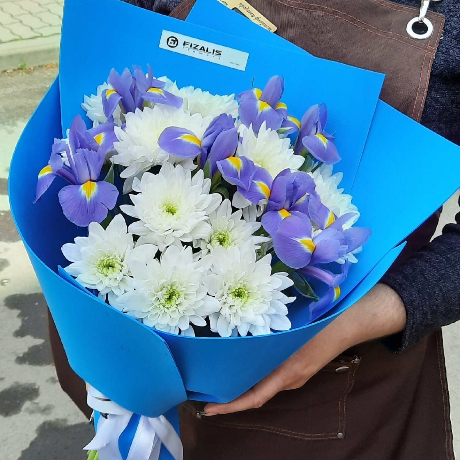 | Описание Состав: Хризантема кустовая, Ирисы, упаковка. Цена цветов может меняться в зависимости от сезона . |
